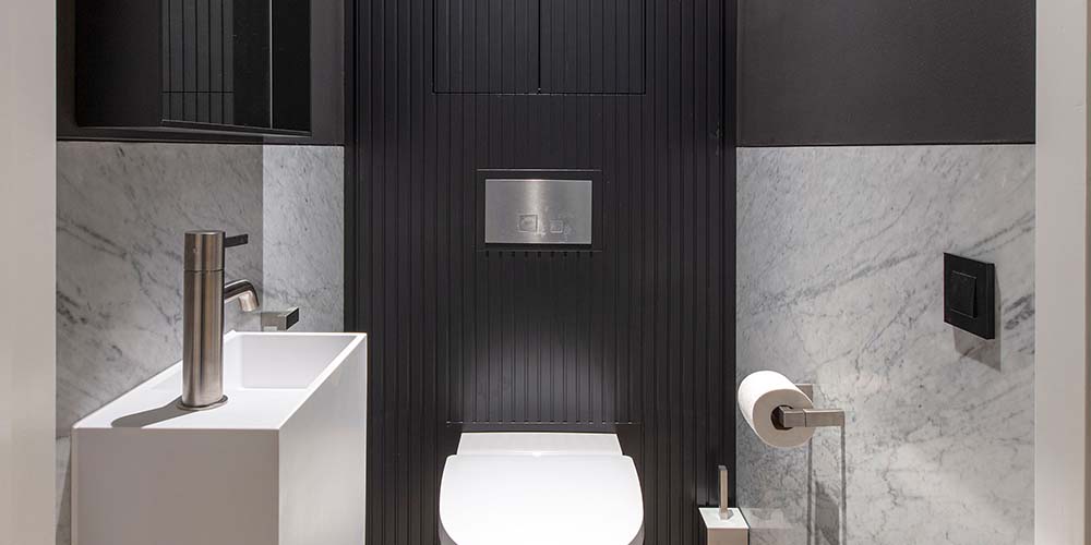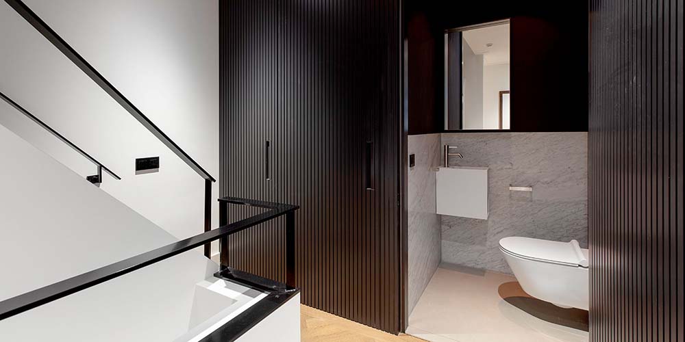De wc op de overloop is verdekt weggewerkt in een kastenwand. De verticale profielen van de kastbekleding loop naadloos door over de deur van de we ruimte.