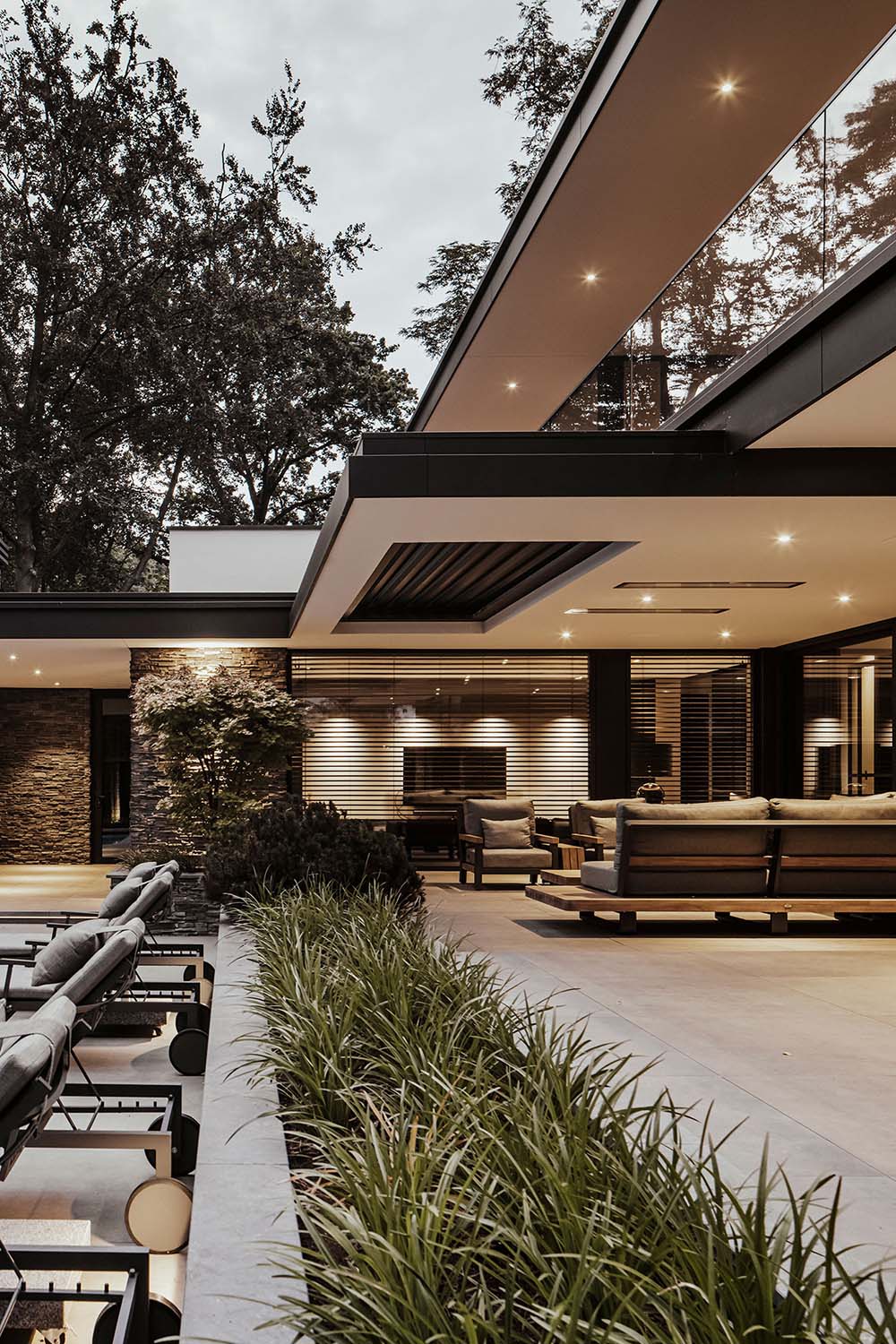 De L-vormige hoofdstructuur, de terrassen en buitenruimtes omsluitend, biedt beschutting en zorgt tevens voor een gevoel van comfort en geborgenheid. Grote glazen schuifpuien grenzend aan het zwembad en de terrassen zorgen voor transparantie en brede zichtlijnen en zorgen voor een optimale verbinding tussen interieur en exterieur.